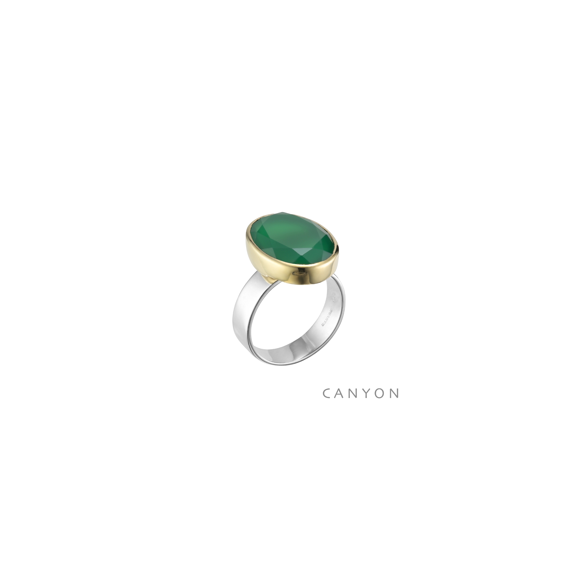Bague argent décorée d'un onyx vert ovale serti de laiton et posé sur un anneau en argent plat et large - Dimensions : 1,8 cm x 1,3 cm - Poids total (g) : 6,63