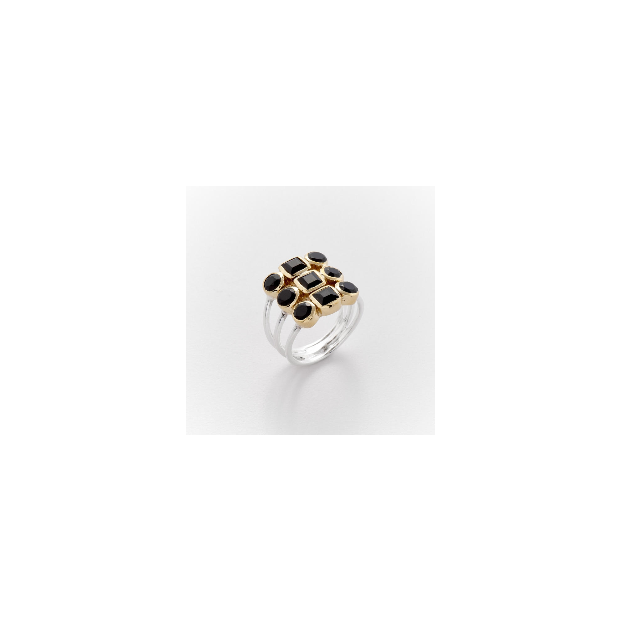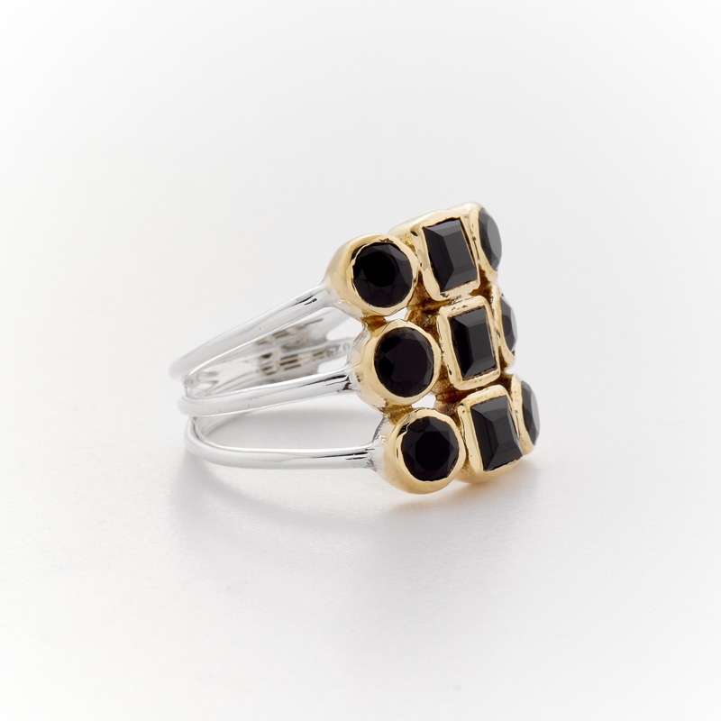 Bague bicolore formée de 3 fins anneaux argent décorés chacun de 2 ronds et d'un carré d'onyx noir sertis de laiton.