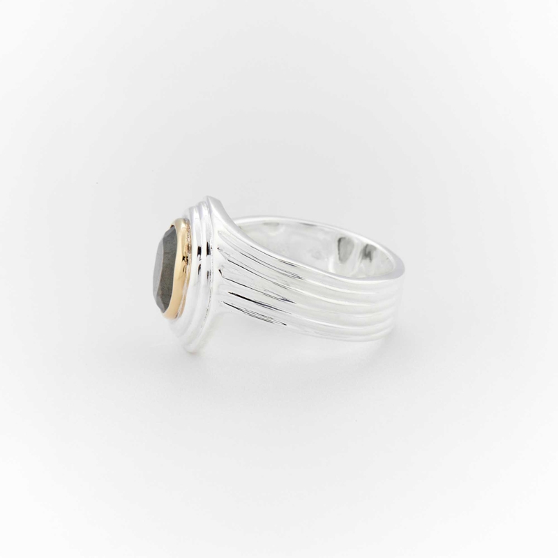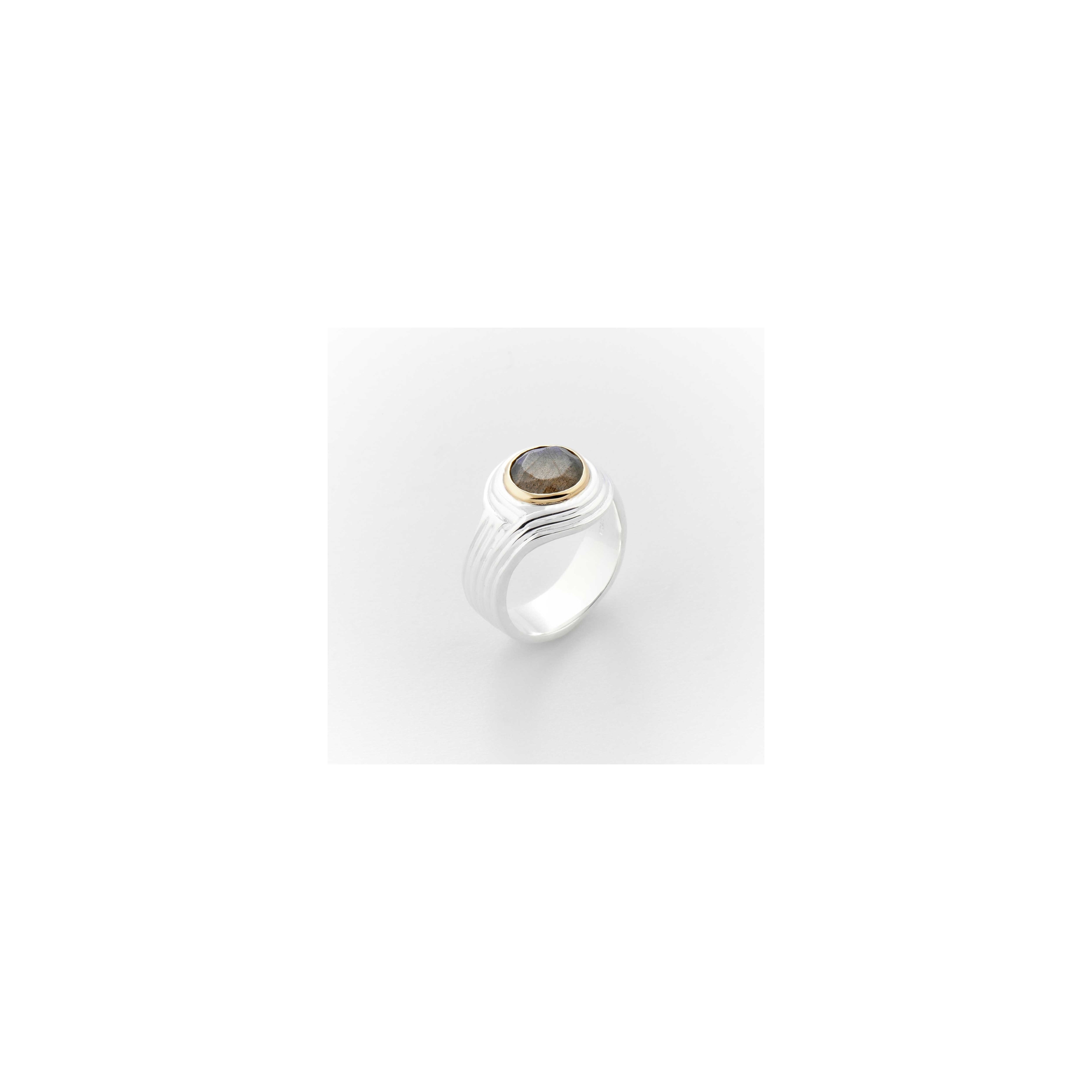Bague bicolore formée d'un rond de labradorite facettée serti de laiton décoré de fins godrons autour de la pierre et sur l'anneau.