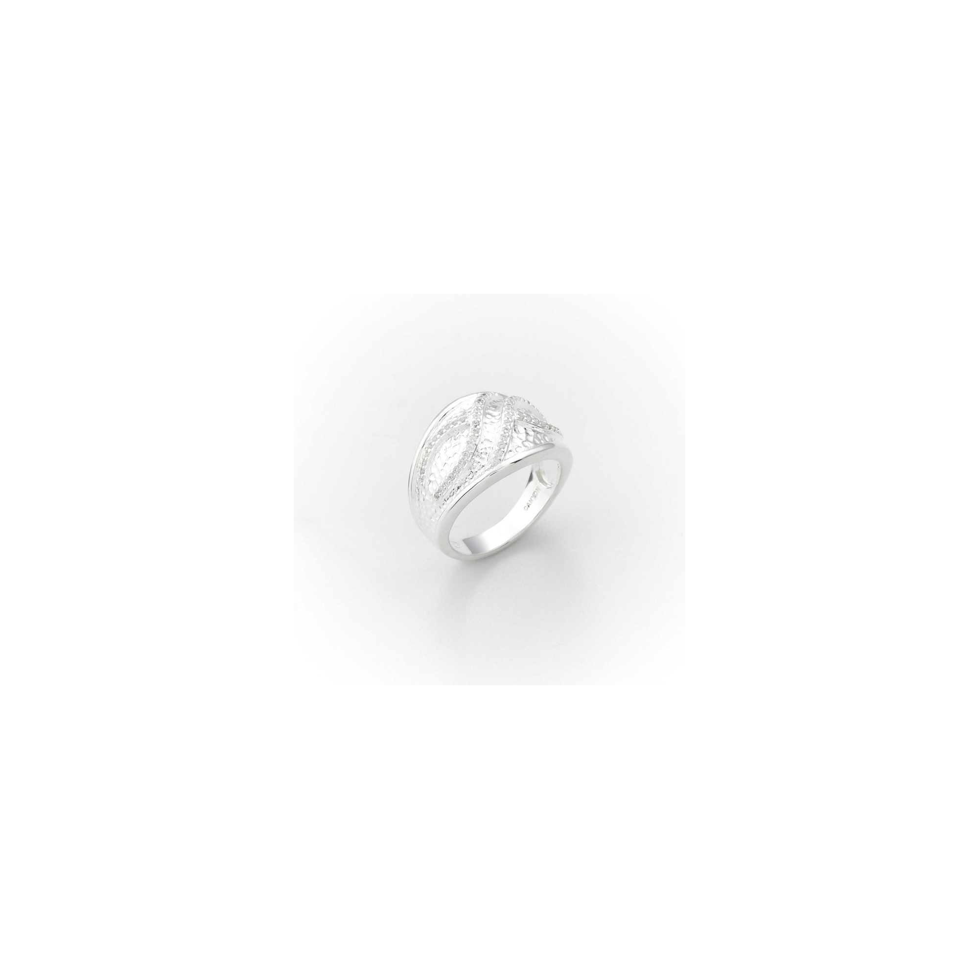Bague argent formée d'un large anneau gravé et décoré d'oxydes de zirconium blancs.