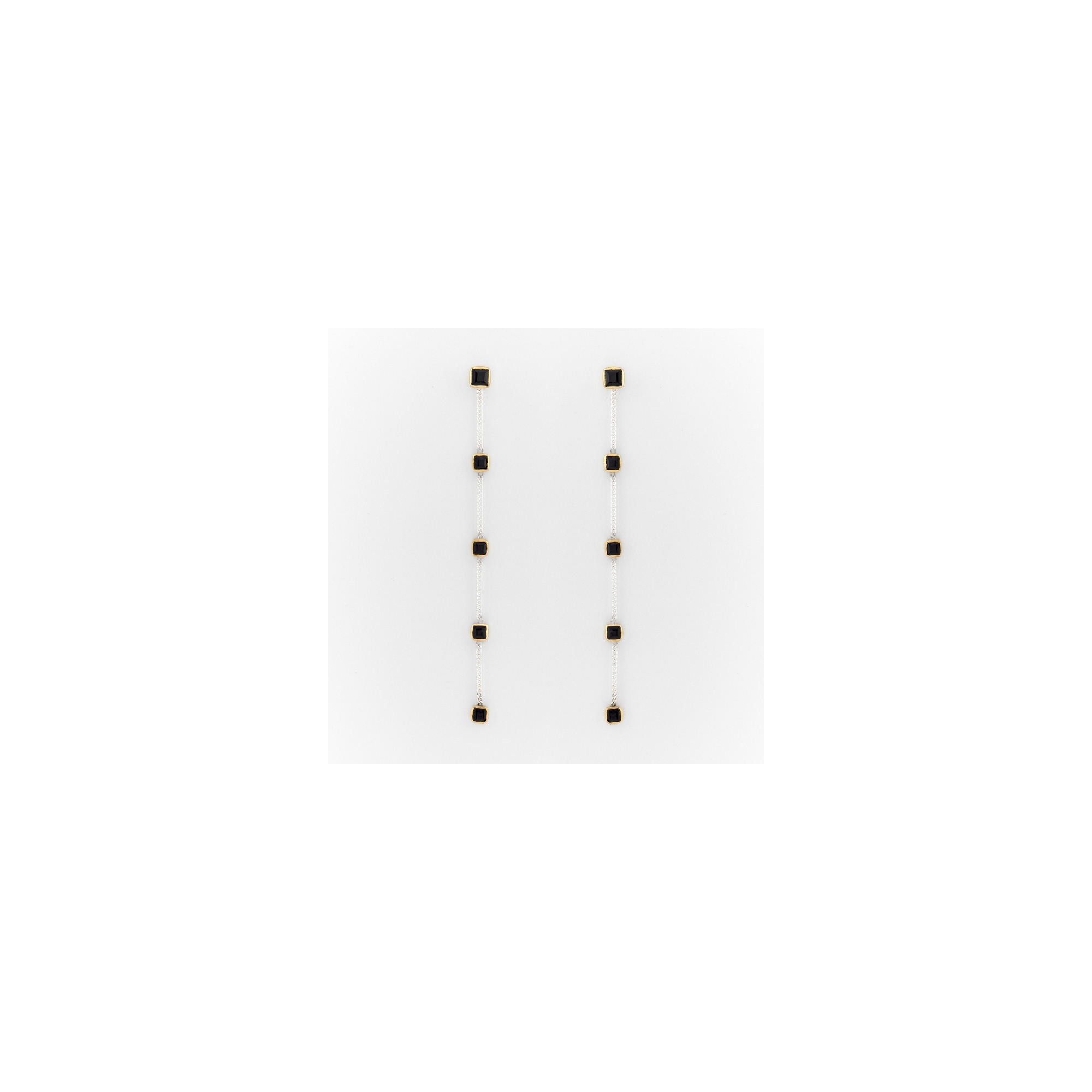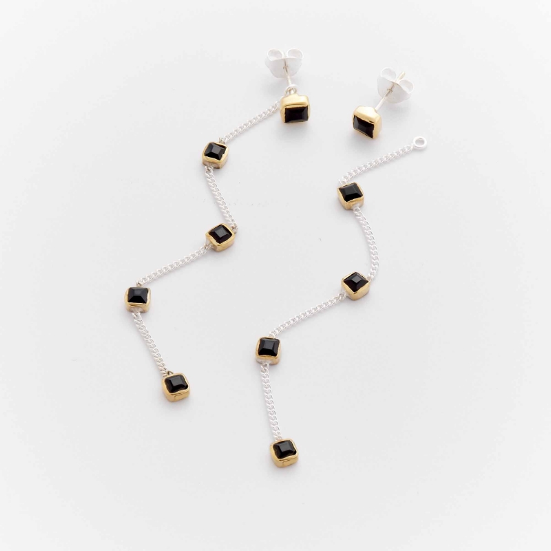 Boucles d'oreille pendantes bicolores formées d'une puce carré sertie de laiton et d'une fine chainette argent décorée de carrés d'onyx noir sertis de laiton.