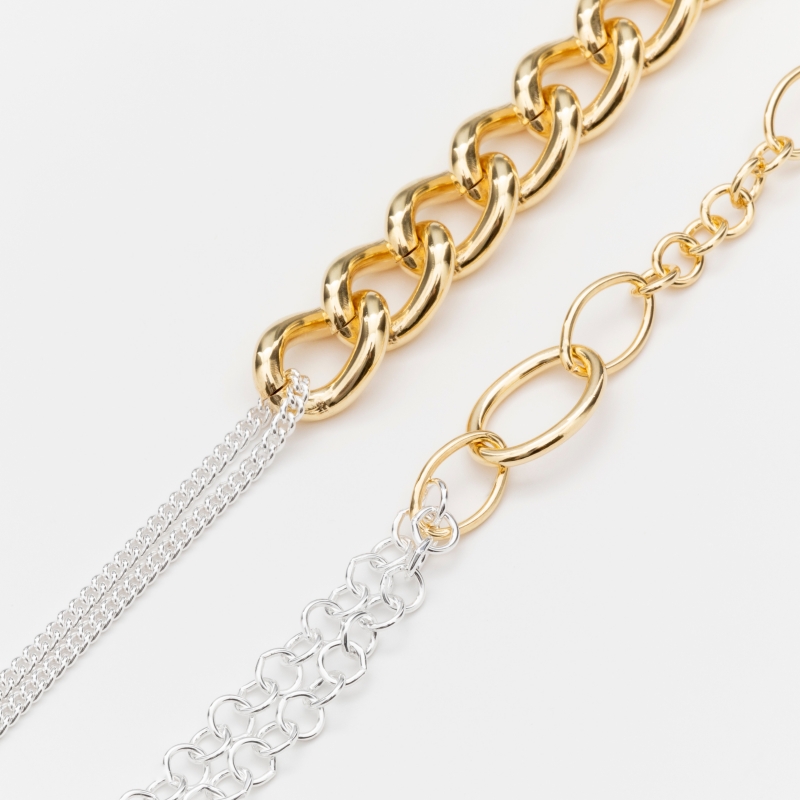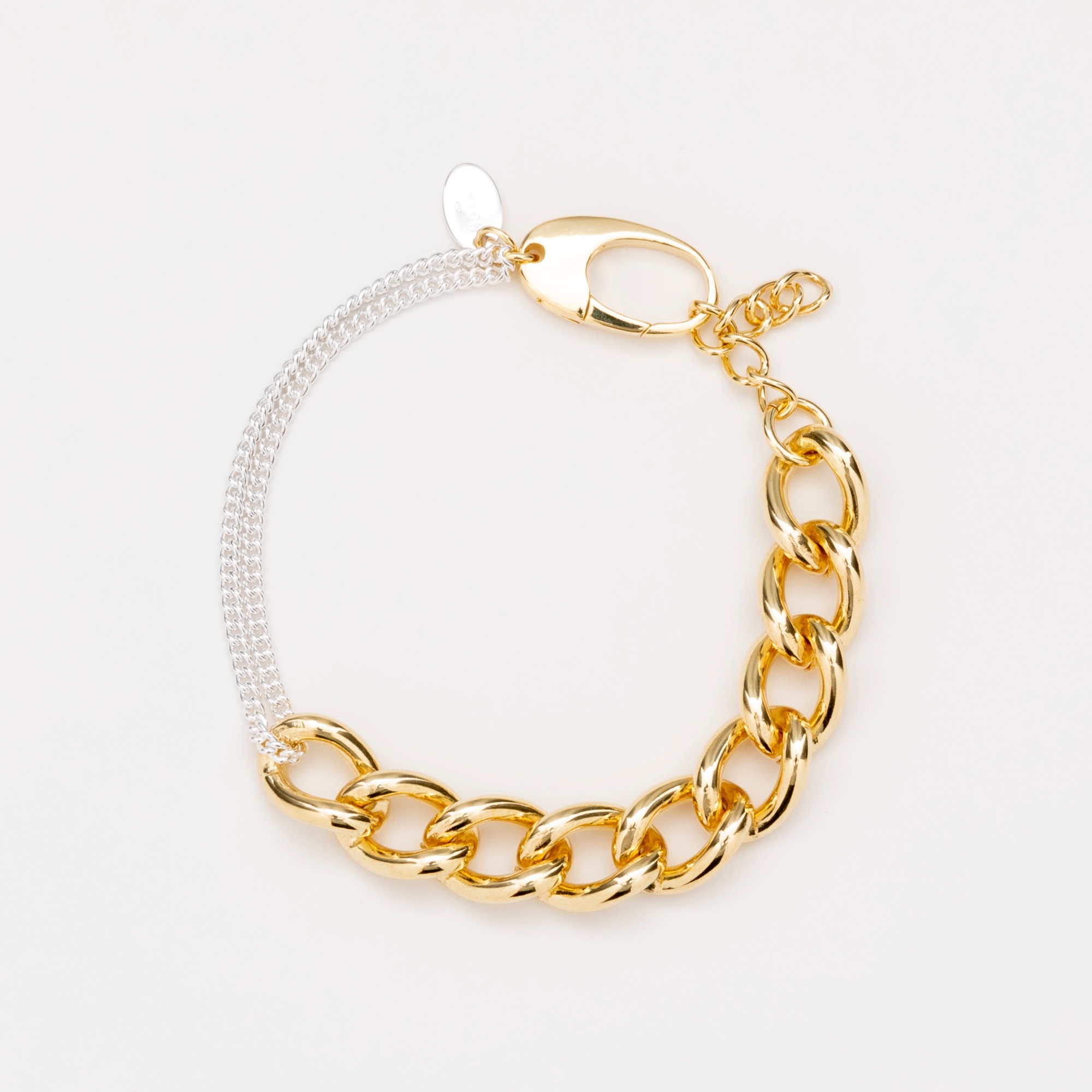 Bracelet en laiton doré composé d'une chaine formée de maillons ovales d'un fermoir ovale d'une chaine d'extension et d'une double petite chaine argent.