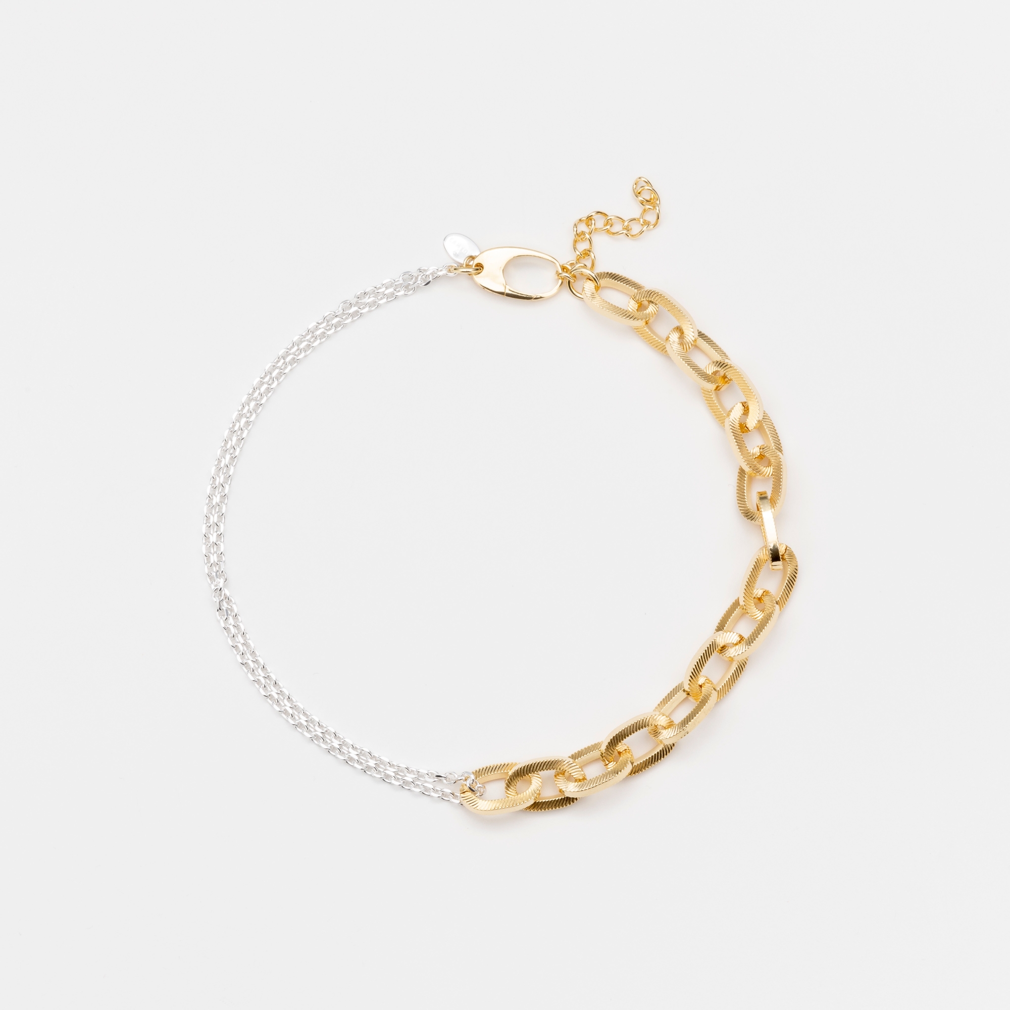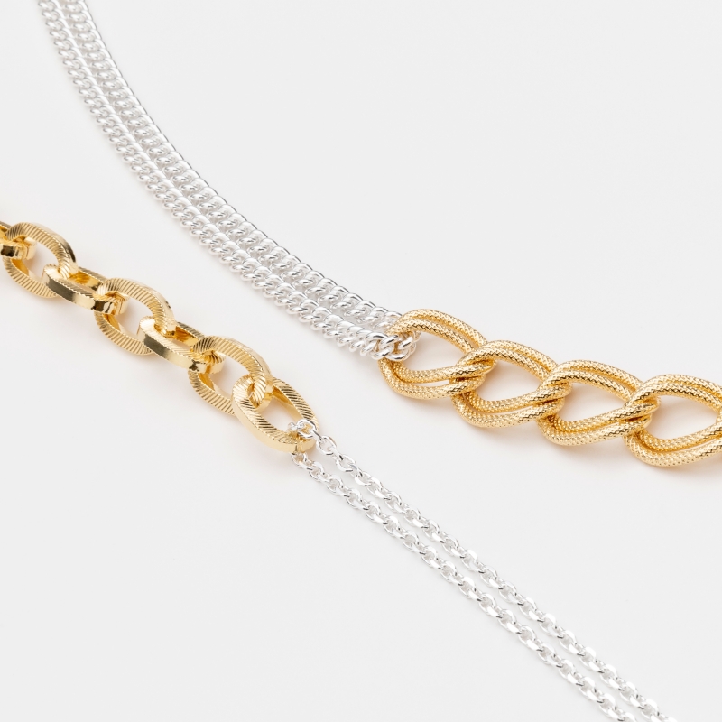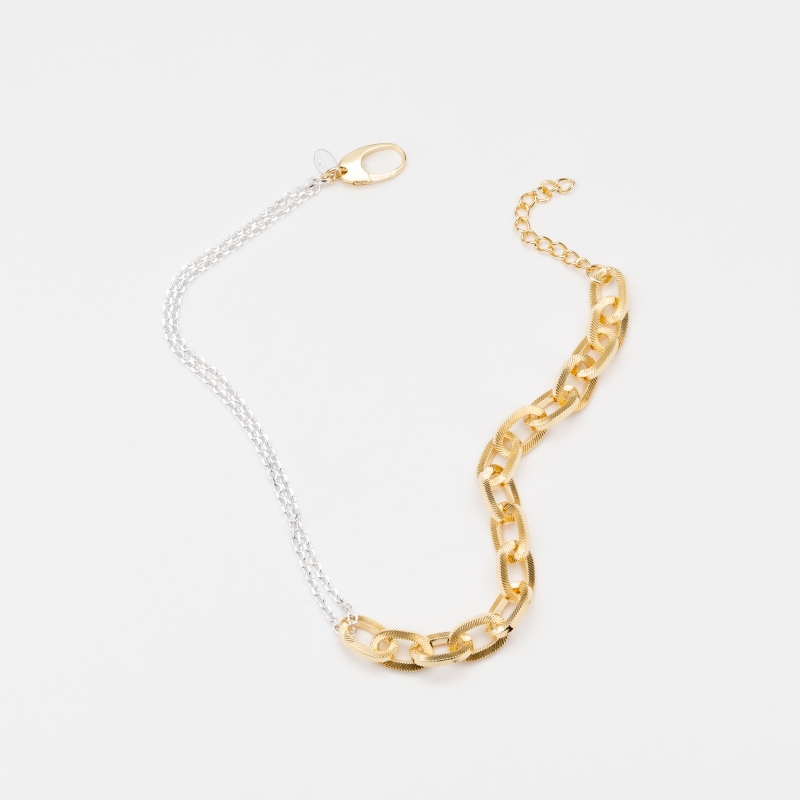 Collier en laiton doré composé d'une chaine formée de maillons ovales travaillés d'un fermoir ovale d'une chaine d'extension et d"une double petite chaine argent.