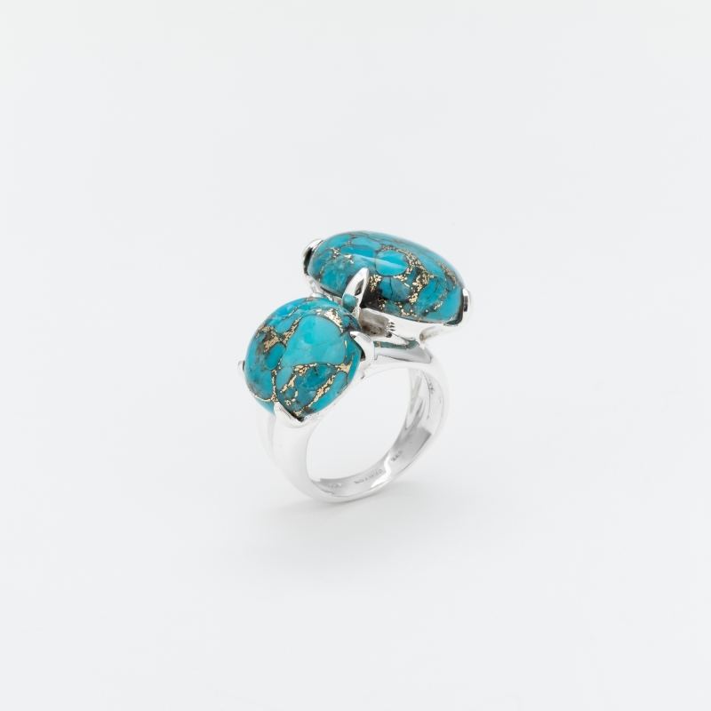 Bague en argent composée de 2 cabochons un d'onx vert et l'autre de calcedoine chrsopraze sertis de longues griffes fines.