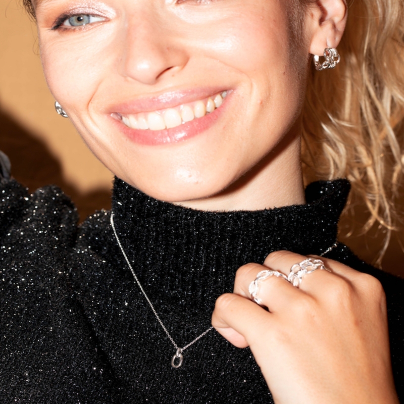 Bague alliance en argent 925 composée de 2 rangs d'ovales lisses reliés entre eux par des ponts décorés d'oxydes blancs.