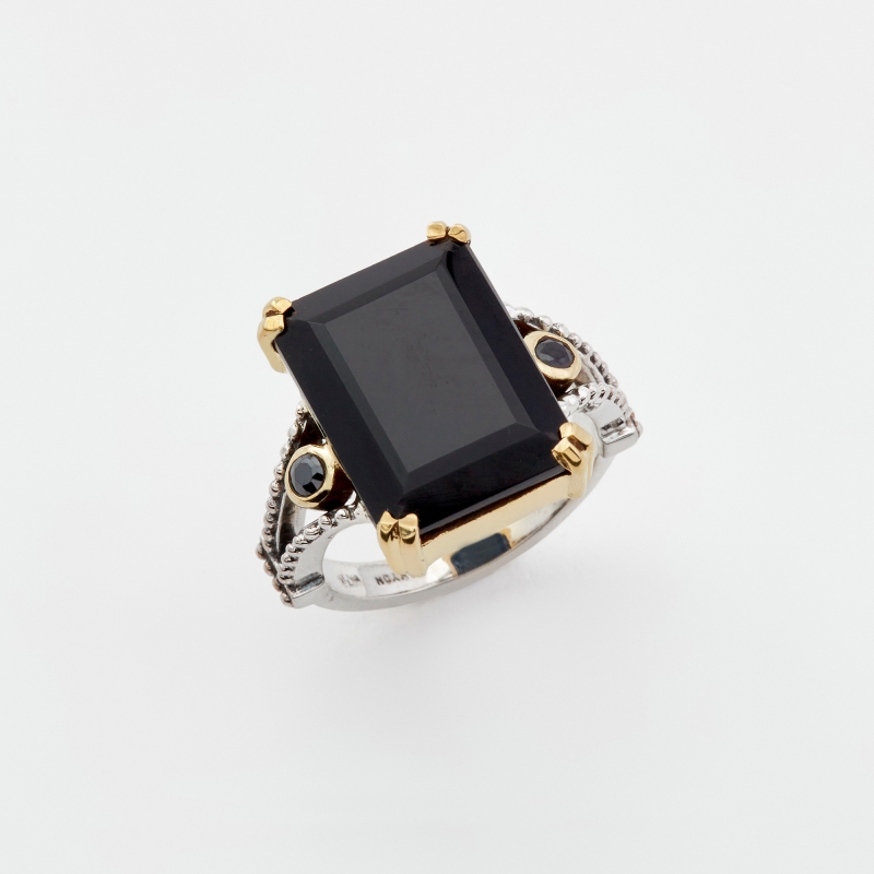 Bague en argent et laiton composée d'un aneau en argent et d'une pierre rectangle serti de laiton avec de petits onyx de chaque côté.