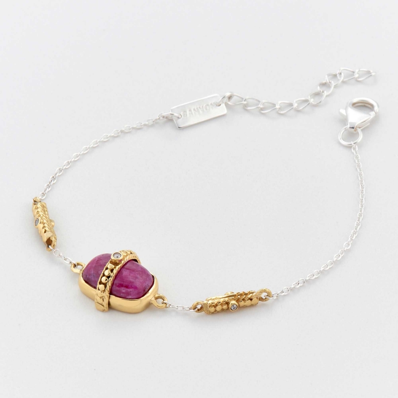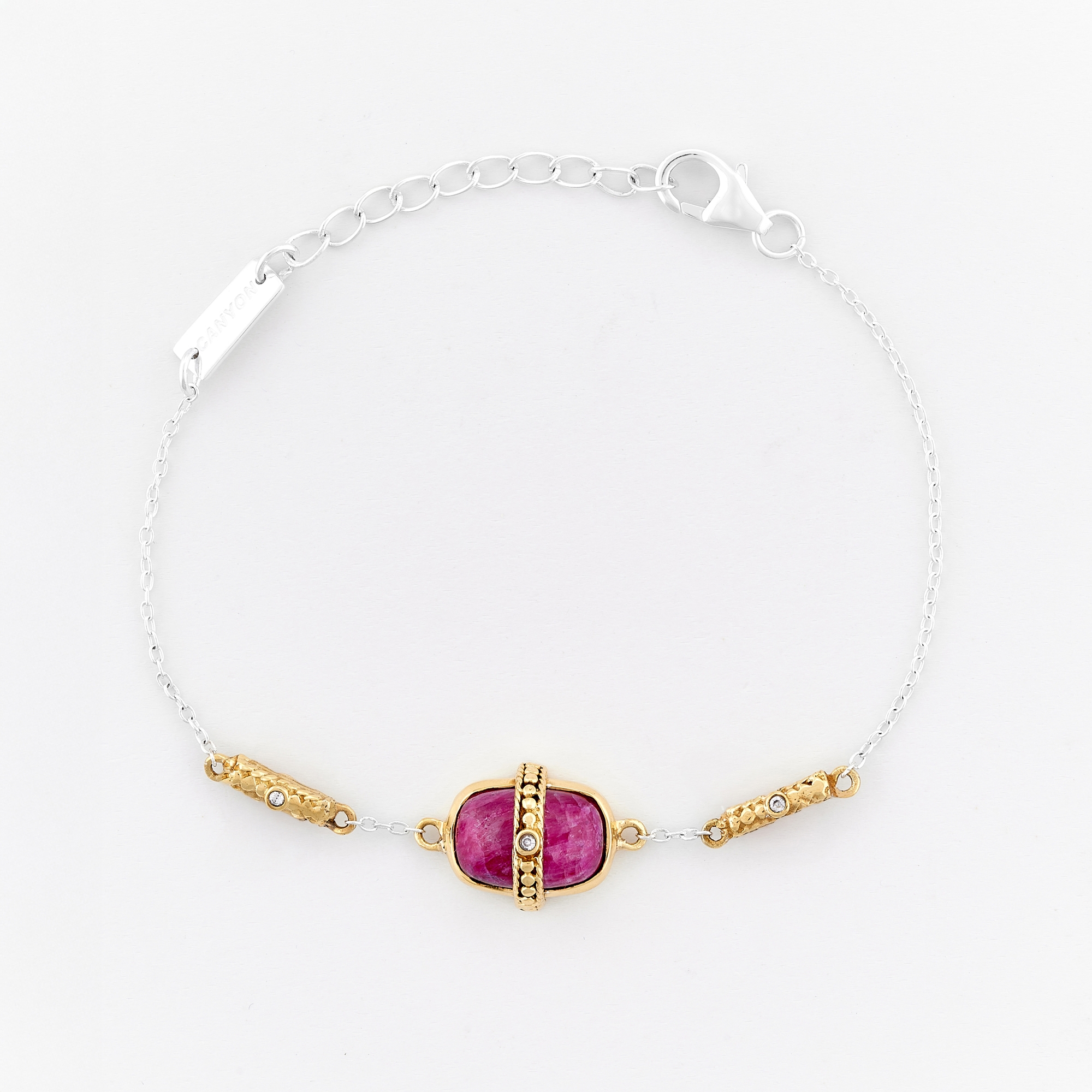 Bracelet composé d'une chainette en argent 925 avec chaine d'extension et en son centre une silimanite ruby ovale sertie de laiton décorée d'oxydes blancs sertis de laiton.