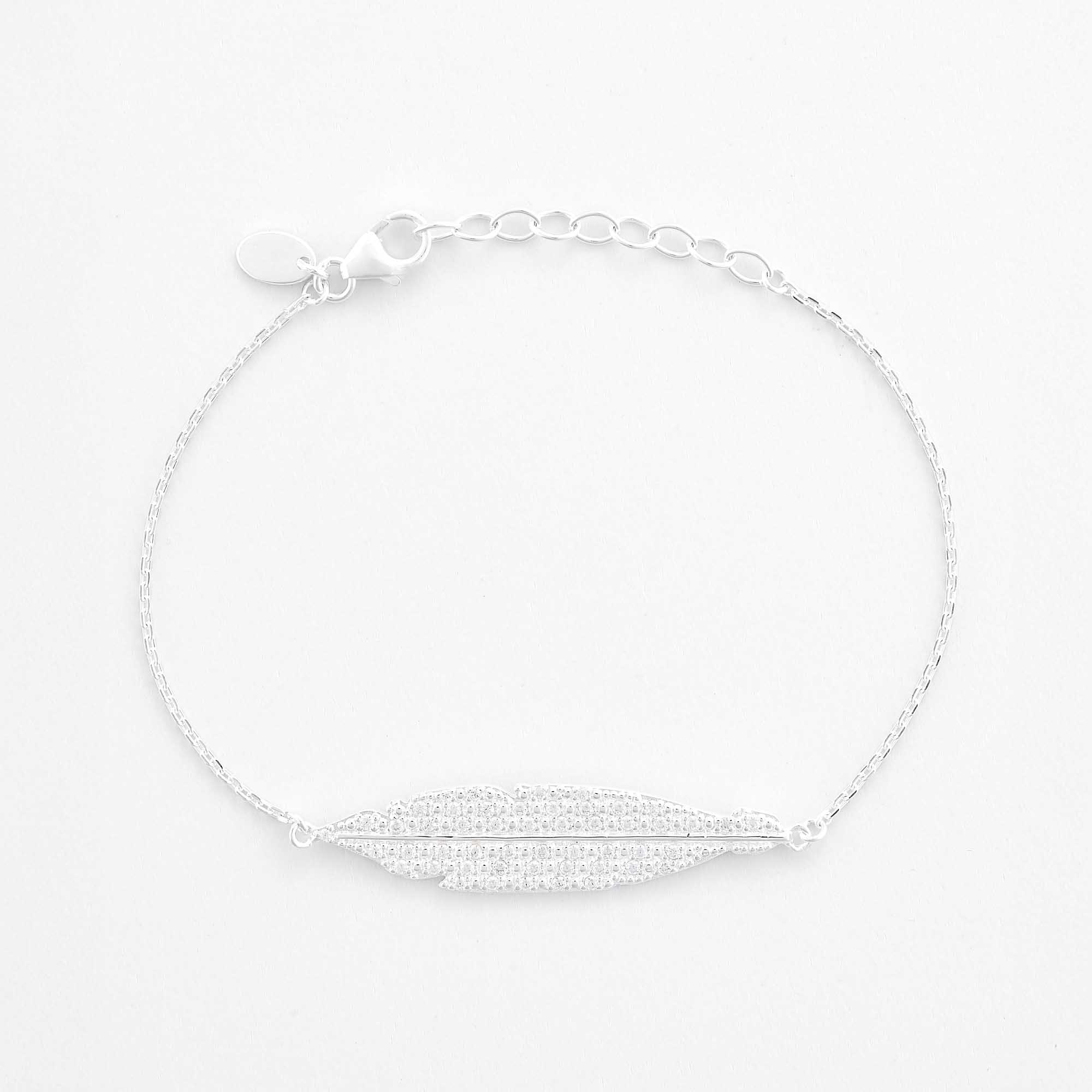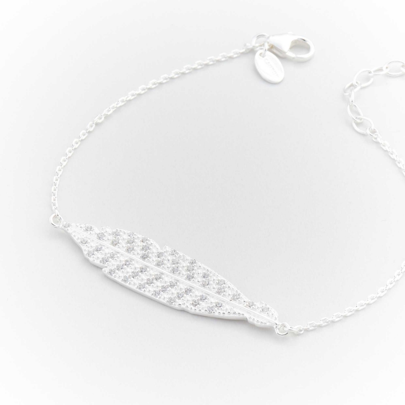 Bracelet en argent 925 composé d'une fine chainette décorée d'une grande plume ornée d'oxydes.