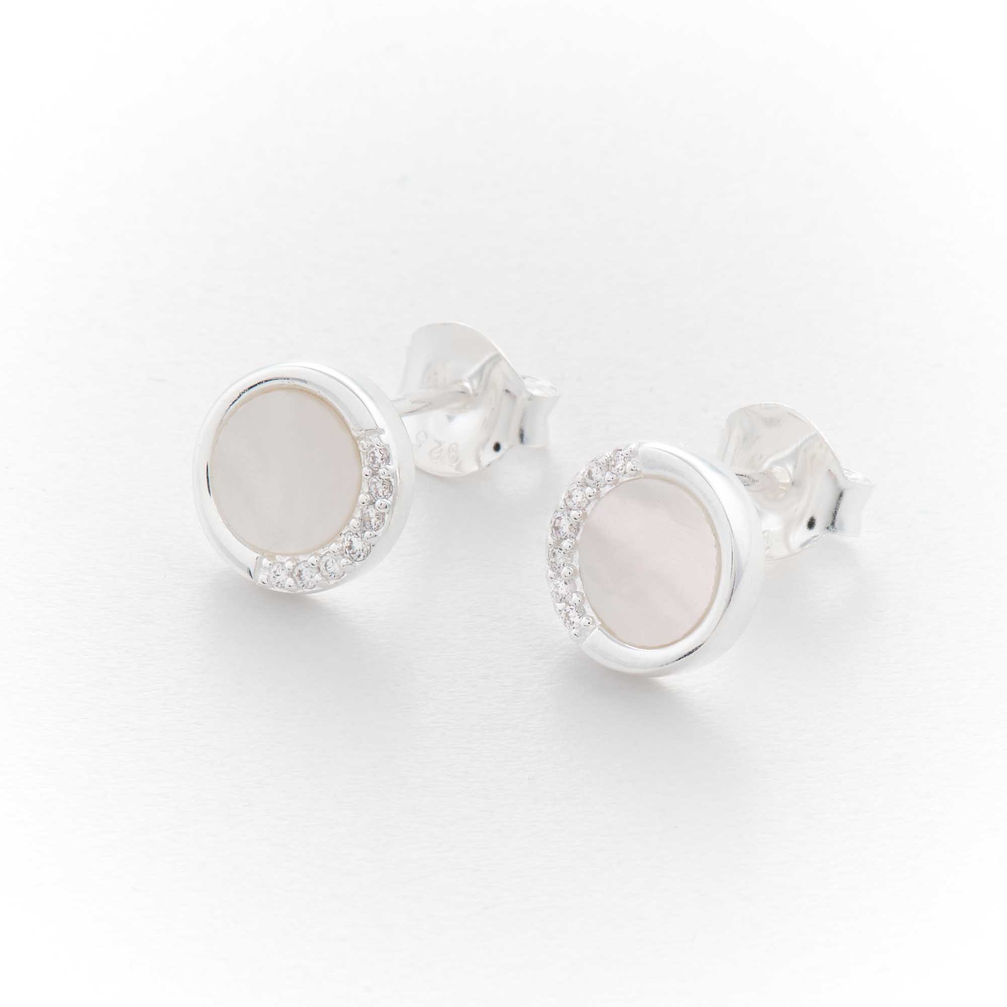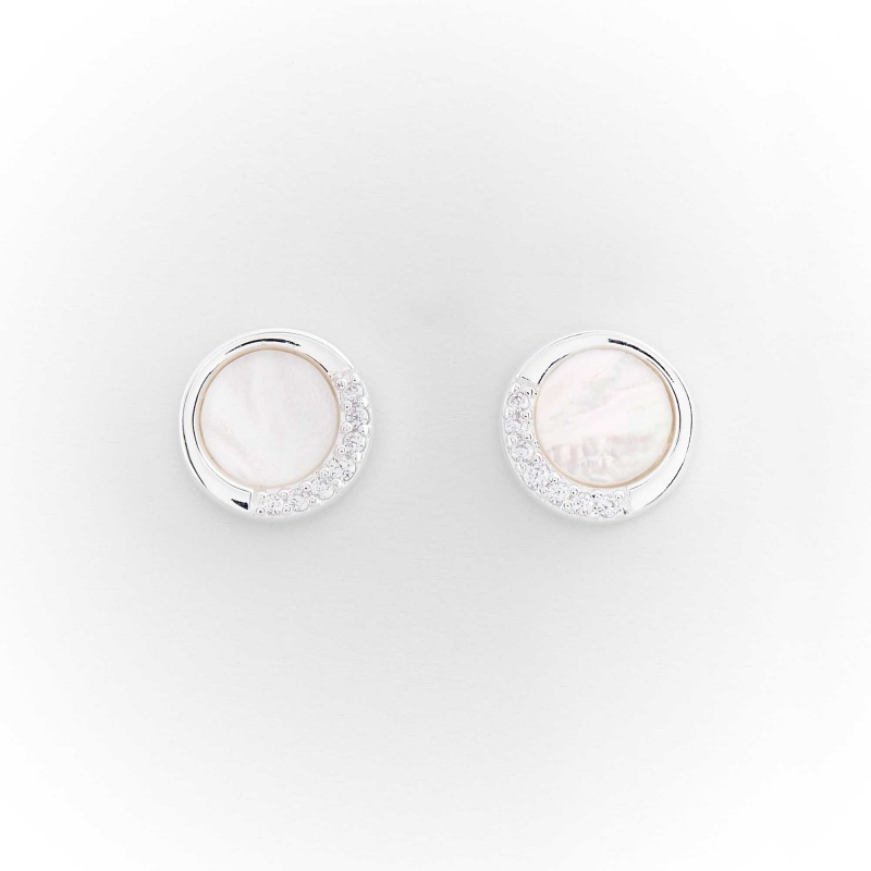 Boucles d'oreilles puces en argent 925 composées d'une nacre blanche ronde et décorées d'oxydes blancs.