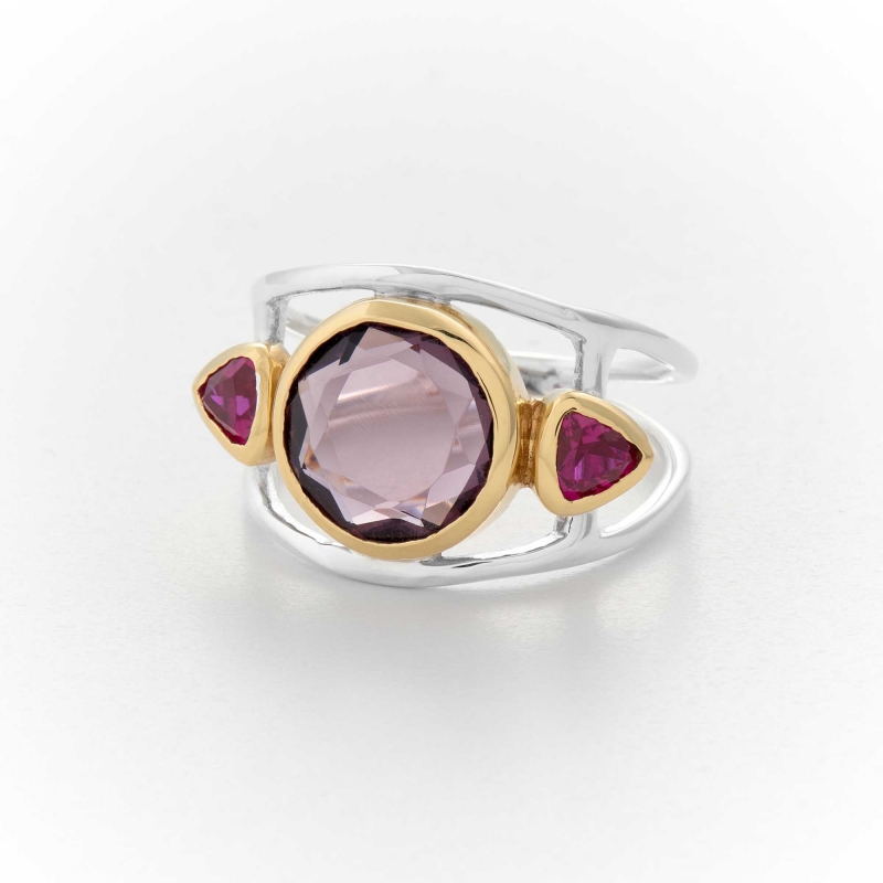 Bague en argent 925 et laiton décorée d'un grand verre améthyste tablette ronde et de chaque côté d'un petit oxyde rubis serti de laiton, les anneaux sont en argent.