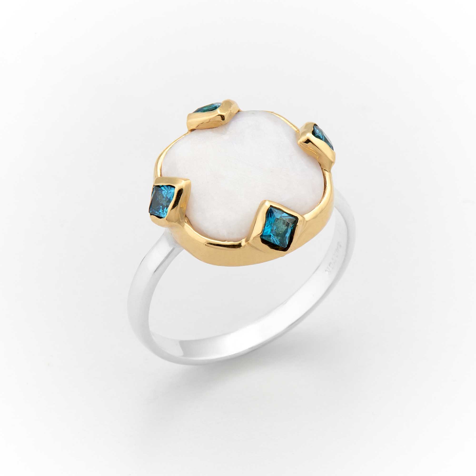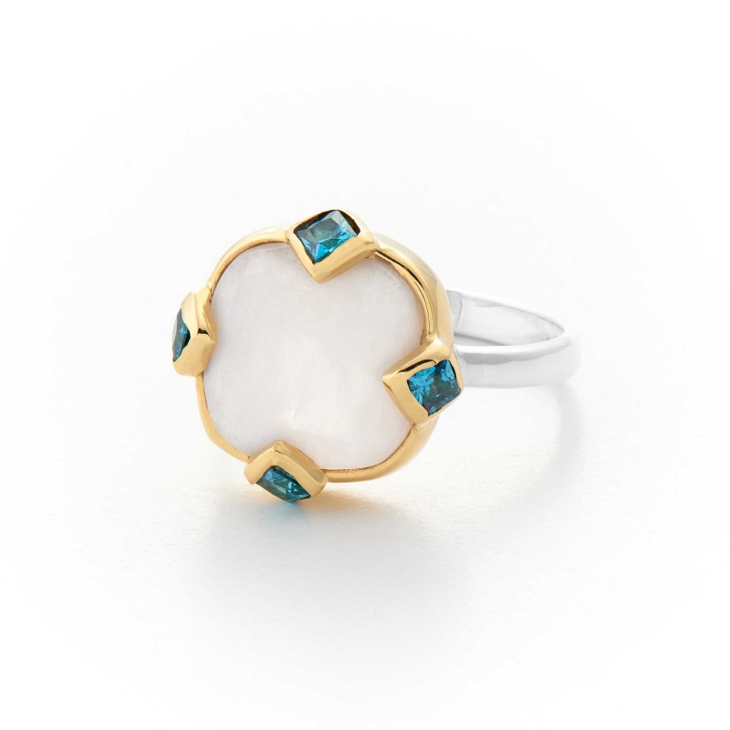 Bague en argent 925 et laiton décorée d'une pierre de lune tablette ronde entourée de 4 oxydes topaze bleue en forme de goutte sertis de laiton, les anneaux sont en argent.