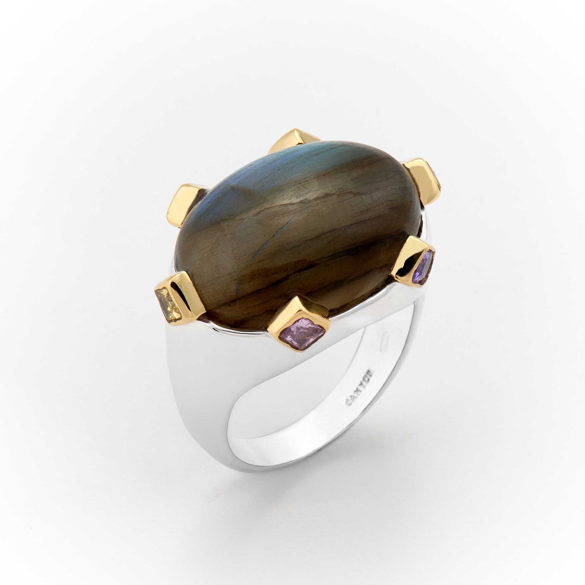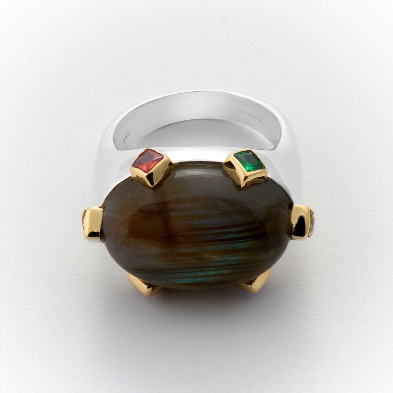 Bague en argent 925 et laiton décorée d'une labradorite cabochon entourée de 6 oxydes multicolores sertis de laiton, les anneaux sont en argent.