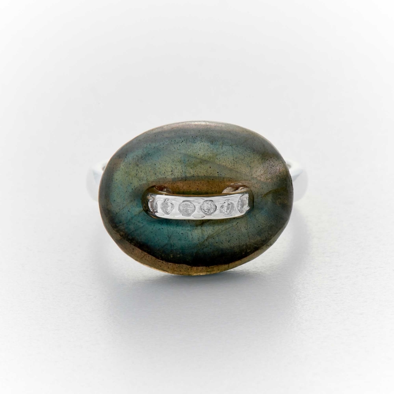 Bague en argent 925 composée d'un grain de café en labradorite décoré d'oxydes blancs sertis, l'anneau est en argent.